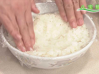 もち米ごはんの半量をのせ、手に水をつけて押さえながらすき間ができないように広げる。