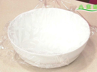 ラップを器からはみ出る大きさに切ってぴったりとはりつける。