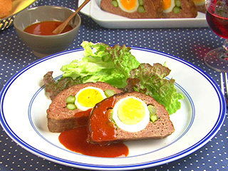 (1)切り口が卵の黄色が出るように、まず真ん中から半分に切る。