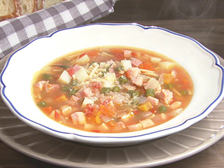 パスタはショートパスタでもよいが、スパゲティを短く折って使えば手軽。太い束では固くて折りにくいので、数本ずつに分けて折る。