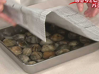 あさりは一般的に砂抜きをして売られているが、砂が残っていることも多く、家で再度砂抜きをして使う。また、塩分の強さが気になる場合は、塩抜きもして使うとよい。 あさりはバットに重ならないように広げ、海水濃度の塩水(水1カップに粗塩小さじ1の割合)をヒタヒタに注ぐ。新聞紙をかぶせ、薄暗い場所に1~2時間おく(砂抜き)。