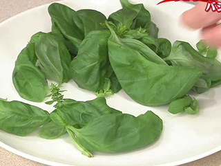 バジリコともいい、爽やかで甘みのある芳香が特徴のフレッシュハーブ。サラダやパスタ、トマト料理などイタリア料理のほか、タイやベトナムなどの東南アジア料理にもよく使われる。多くの品種があるが、一般的に出回っているのは「スイートバジル」。