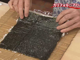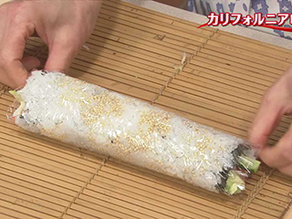 巻きすをはずし、ラップをつけたまま巻き終わりを下にして置く。