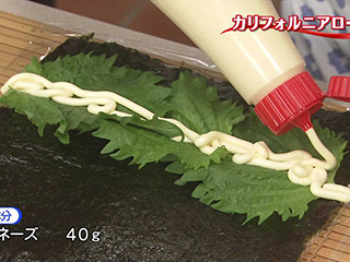 焼きのりの手前側に青じそを敷き、マヨネーズを絞り出す。、