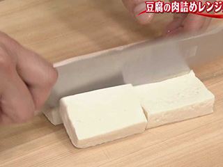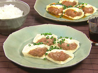 肉だねはギョーザの味、皮の代わりに豆腐にサンドします。