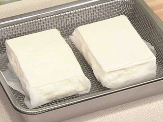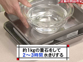 (1)豆腐をペーパーに包み、ザルにのせる(ザルと下にしくバットとの間にすき間ができるものがよい)。