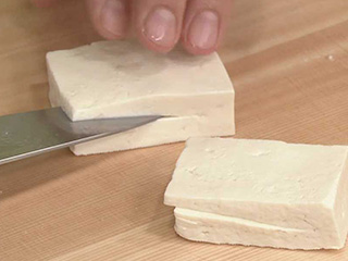 (4)豆腐の厚みを半分に切り、4等分に切る。