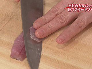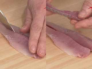 (1)身の真ん中にある小骨の両脇に包丁を入れ、半分に切って骨を除く。