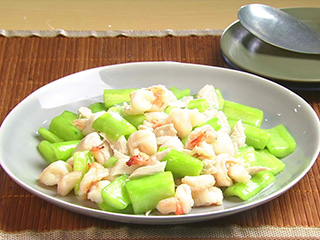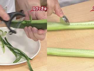 きゅうりはピーラーで皮をむき、種をスプーンで薄くそぎとってから使う。さらに塩をして水気を絞ることで調味料がしみやすくなり、さっと炒めるだけで味がつき、色鮮やかに仕上がる。