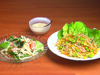 サラダうどんの麺はマヨネーズだれがよくからむ太めがおすすめ。