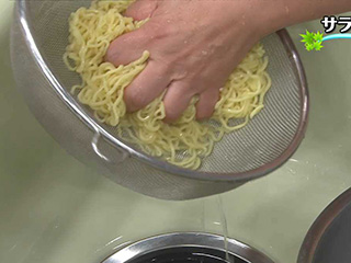 (3)水気をきり、さらにザルにめんをギュッと押しつけるようにして、しっかりと水気をきる。