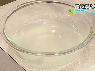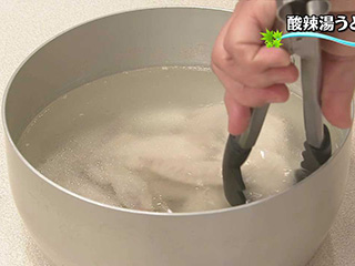 (2)ザルにあけ、流水でしっかりともみ洗いし、表面のぬめりをよく落とす。