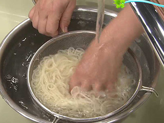 (3)水気をきり、さらにザルにめんをギュッと押しつけるようにして、しっかりと水気をきる。