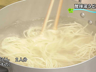 (1)鍋にたっぷりの湯を沸かし、うどんをパラパラと入れる。ふきこぼれない程度の強めの火加減にし、ときどきかき混ぜながら袋の表示時間通りにゆでる。