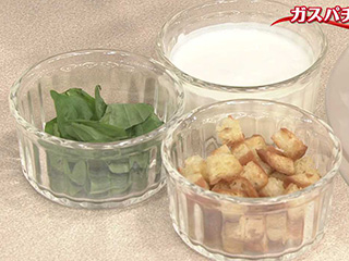 1cm厚さのバゲット5枚を1cm角に切る。オリーブ油大さじ1強とつぶしたにんにく1かけ分を中火で熱し、バゲットをこんがり炒める。