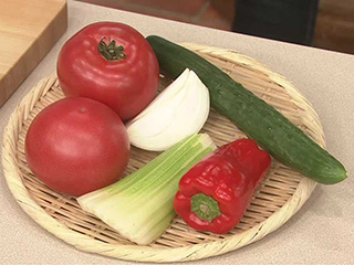 トマト、セロリ、赤ピーマン、玉ねぎ、きゅうり、こしょう、塩、白ワインビネガー、オリーブ油。