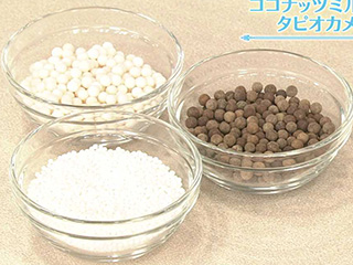 中華甜心でもおなじみの、キャッサバという芋の根茎からとったデンプンで作られる。粒状に加工したものをタピオカパールともいい、黒はカラメルで着色したもの。粒は大小あり、小さいほうがゆでる時間が短くてすみます。