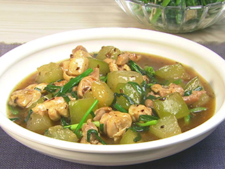 冬瓜の美しい色もおいしさのうち、皮は薄くむき、豆チも仕上げに加えて、グリーンを残すようにします。