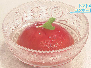 器にトマトのコンポートを盛り、シロップをかけ、ミントをあしらう。