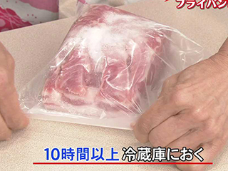 冷蔵庫に入れて10時間以上おくことがポイント、必ず、焼く2~3時間前に室温にもどしておくこと。