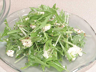 材料: 木綿豆腐・・・1丁(300g) 水菜・・・100g ごま油・・・大さじ1/2 塩・・・小さじ1/3 金ごま・・・大さじ1 作り方 (1)豆腐はペーパーに包んで水気をきる。水菜は3~4cm長さに切る。 (2)水菜に豆腐をくずしながら加え、ごま油、塩、ごまをふり、あえる。