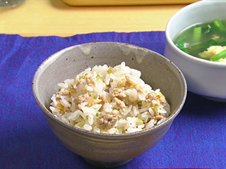 具を炒めてから炊き込むことでうま味をひき出すのがおいしいコツ。