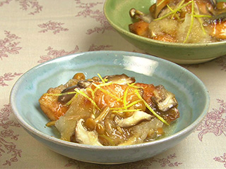 鮭は生鮭を選び、そぎ切りにして火の通りをよくします。