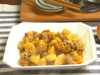 豚肉は一口大にざっくり丸めて焼きつけておくのがおいしいポイント。