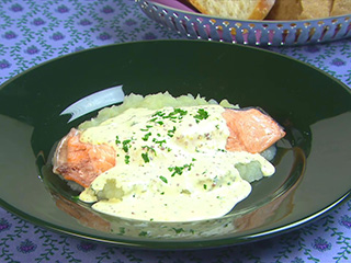 鮭をソース状のじゃが芋、クリームソースと一緒にからめながらいただくのがおいしいポイント。