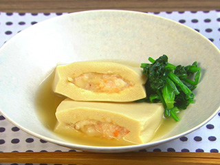 高野豆腐は熱めのお風呂くらいの温度の湯につけてもどします。