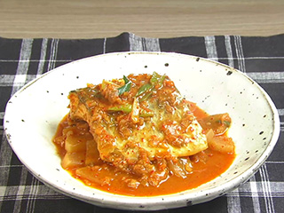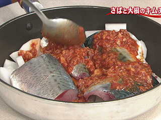 さばは鍋にくっつかないように大根の上に並べ、上に残りのキムチをのせる。さばのうまみが大根にまわっておいしく煮上がる。
