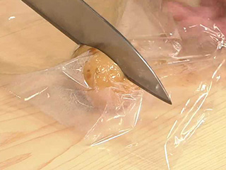 ラップをかぶせて切ると、、、卵黄が包丁につかずラップも切れず、きれいに!