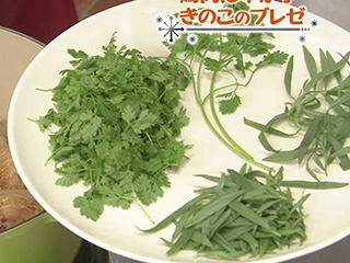 セルフィーユとエストラゴンは熱に弱いので、仕上げに加えて香りを生かす。手に入らない場合はパセリのみじん切りを使っても。
