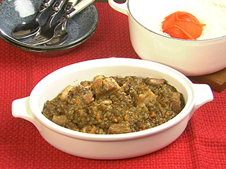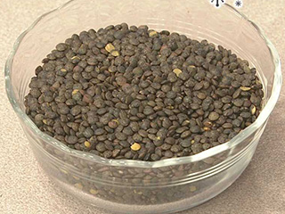 ヒラマメ(扁豆)、レンティルとも呼ばれる、直径4~9mmの丸く扁平な凸レンズ状の豆で、紀元前から栽培されています。食物繊維、ビタミンB群、鉄、亜鉛、たんぱく質の含有量が多く、高たんぱく低カロリーの優秀食材。黒、茶、緑、赤、黄などの色の品種があり、煮込み、カレー、スープ、サラダなどに使われます。短時間でもどすことができ、そのまま煮てもやわらかく調理できるのがうれしいところ。皮つきと皮なしがあり、皮なしは早く煮えるのですが、どろどろに溶けてしまうので、この料理には皮つきがおすすめです。