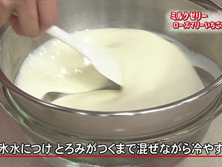 ボウルの底を氷水に当て、ヘラなどで混ぜながらとろみがつくまで冷やす。とろみをつけてから器に流したほうが、均一に効率よく固まる。