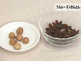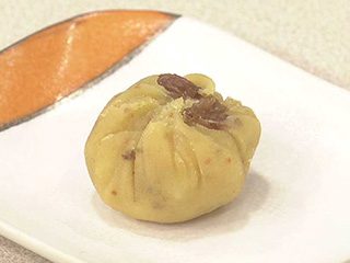 ぬらして固く絞ったさらし(またはラップ)に、ラムレーズンきんとんをのせ、口をキュッと絞って形を作る。器に盛り、あれば金箔を飾る。