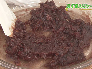 ゆであずきは水分を飛ばしてから使う。ものによって水分量が異なるので、電子レンジに1分ずつかけながら様子を見る。熱い状態でフォークですくってみて、もったりとして落ちなくなればよい。