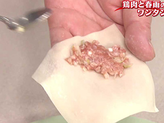 ワンタンの皮に、肉だねをスプーン半分くらいをのせる。