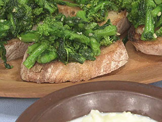 菜の花のブルスケッタは、菜の花がくったり柔かくなるまで火を通しておくのがポイント。