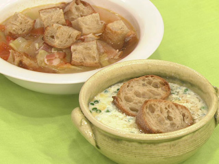 春野菜スープにパンを入れて汁を吸うまで煮込んで食べてもOK。