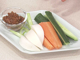 にんじんやきゅうり、かぶなどをスティック状や食べやすく切って器に盛り、しょうゆ麹適量を添え、つけながら食べる。