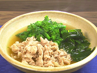 塩ゆでして水気を絞った菜の花をぬれ布巾でさっとふいた昆布でくるみ、ラップなどに包み、一晩おく。