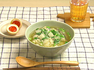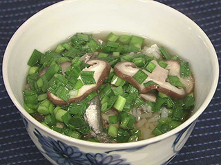 材料2人分 ごはん(温かいもの) 茶碗2杯分 にら 1/2わ 生椎茸 4枚 煮干し 6尾 水 2+1/2カップ 酒 小さじ2 しょうゆ 小さじ1 塩 小さじ1/2 ごま油 小さじ1