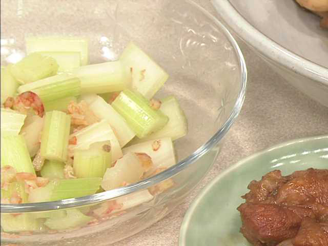 材料: セロリ・・・2本 干しえび・・・10g 塩・・・小さじ1/2 砂糖・・・小さじ1/2 酢・・・大さじ1+1/2 ごま油・・・小さじ1 作り方 (1) 干しえびはぬるま湯大さじ1につけてもどし、細かく刻む。 (2) ボールに調味料を入れて混ぜておく。 (3) セロリは筋をひき1.5cm角に切り、熱湯でさっとゆで、ザルに上げ水気をふいて(2)に加えてあえる。