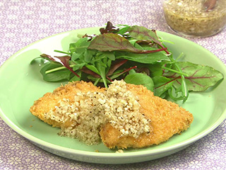 衣は卵の代わりに小麦粉水をまぶすのがポイント、この衣がかつおをしっかりガード、ふっくらと揚がります。