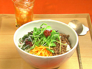 肉そぼろはフライパンが冷たいところにひき肉と調味料を入れてよく混ぜてから火にかけること。