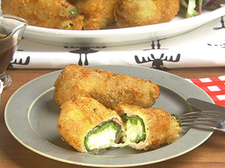 口の部分から中身が出てこないように豚肉でしっかり包み込むこと(先端はピーマンがはみ出してOK)。