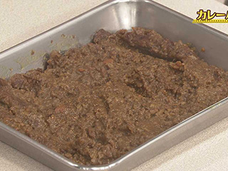 カレーはバットなどにとり、室温で冷まして固める(残りもののカレーなど冷蔵庫に長時間入れて冷えている場合は、室温に出して20分ほどおく)。水分の少ない固めのカレーのほうが扱いやすいので、水分が多いものは火にかけて水分を飛ばし、また具材が大きいものはヘラなどでつぶす。