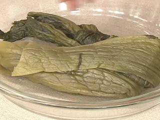 高菜漬けは塩辛いので塩出しして使う。水を2~3回かえながら軽くもみ洗いし、食べてみて塩分が少し残っているくらいになればよい。