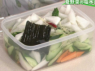 もう一品の塩水漬けは、たっぷり作っておくととっても便利、日を追うごとに塩気が効いてきます。
